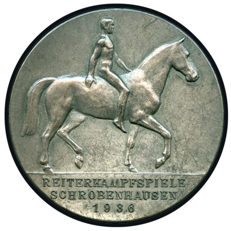40345   image1936 Horse Riding championships in Schrobenhausen: Merit medal, silver, by Polleath, showing rider on horse on one side and “DEM VERDIENSTE” with laurel surround on the other, fine