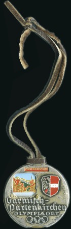 40370   imageCommemorative medal with different rotating views of Garmish-Partenkirchen in gilt and enamel, 38mm, casing silvered with enamel, showing Garmisch shield and “OLYMPIA ORT” with Olympic rings, reverse with Bayern coat of arms, silver a little toned otherwise fine and attractive