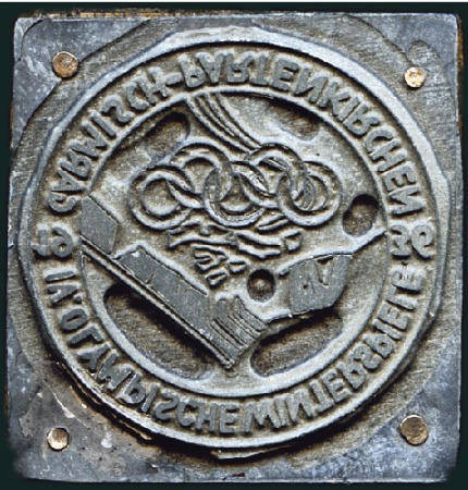 40347   image1936 Garmisch-Partenkirchen. Handstamp of the official visitor’s pin, lead, 40x39mm, on top of wooden block 21mm high, rare