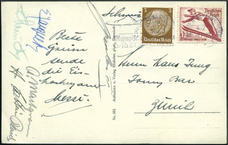 40381   imageGroup of 10 covers/cards, incl. four with 3pf tied by special Olympic cds and “Olympia-Skistadion”, “Olympia-Bobbahn”, “Olympia Eisstadion” and “Sonder PA Reissersee” handstamps, three used Olympic postal stationery cards, and three unused postcards depicting competitors