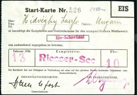 40360   imageGroup of items belonging to a member of the Austrian Ice Hockey team at the 1936 Games, incl. 1936 Garmisch ID card (missing photo), three letters of which two relate to the Winter Games and one to the Summer Games, 1937 Int. University Games ID, fabric patch and small photos (3), Austrian Ice Hockey Federation ID, some personal correspondence and papers, plus and Austrian Olympic Committee brass plate awarded to Olympic participants in 1986 (in original box), interesting group