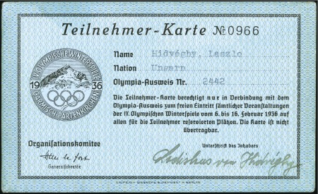 40353   imageIdentity Card: Official identity card for a German official, issued by the Organizing Committee, small stain caused by staple holding picture in place, fine & scarce