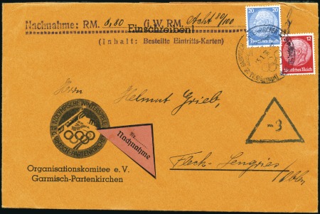 40376   image1936 (Feb 6) Envelope sent registered with 1936 Winter Olympics set of three tied by special Olympic cds, with Garmisch reg’d label tied by “Sonder PA Riessersee / Garmisch Partenkirchen” hs, and Games legend boxed hs, very fine