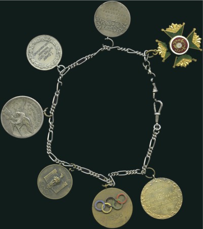 40411   imageWatch Chain with 7 Shooting Prize Medals from 1930 to 1936, from 33 to 40mm, in silver (2) and bronze (5), 2 of which are from Berlin 1936 showing Olympic rings