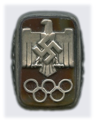 40422   imagePresentation Ring of Reich Sport Minister von Tschammer und Osten to German Olympic Medal Winners, 18x27mm, silver with onyx stone, showing eagle with Olympic rings on face and oak leaf decoration on side. Presented to medal winners deemed true Aryan athletes
