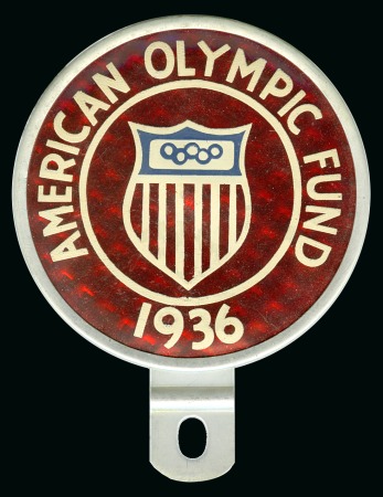 40399   imageAmerican Olympic Fund 1936 Car/Bike Plaque, 87x103mm, steel with reflective red background, showing American shield bordered by legend