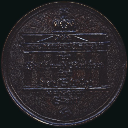 40412   imageCity of Berlin Olympic Games Presentation Medal 1936, 94mm, cast bronze, showing high-relief Berlin coat of arms bordered by legend on front and further inscription with Brandenburg Gate and Olympic rings on reverse, in presentation case.