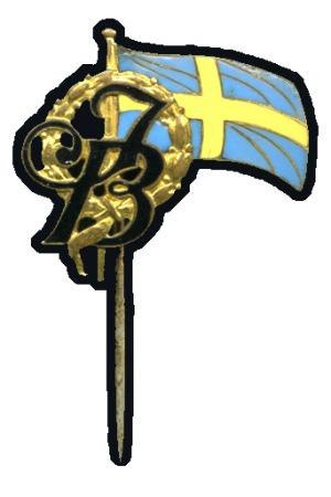 40404   imageSwedish Press “Idrotts-bladet” stick-pin, 25x23mm, goldplated with enamel, showing national flag with “IB” in wreath, a little wear to plating.