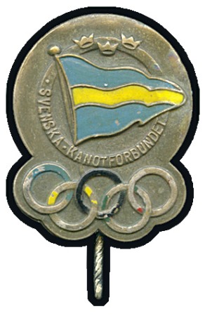 40408   imageSwedish Canoeing Team stick-pin, 21x29mm, silvered with enamel, showing Swedish sailing flag bordered by inscription with coloured Olympic rings below, toned,some colour missing from rings and pin is shortened