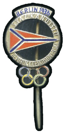 40397   imageCzech Canoe Federation stick-pin, 20x30mm, silvered with enamel, showing pennant encircled by legend with “BERLIN 1936” above and coloured Olympic rings.
