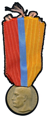 40402   imageItalian Merit Medal (circa 1936), 31mm, bronze, showing head of Mussolini on front and NOC logo on reverse, incl. orange, blue and red striped ribbon.