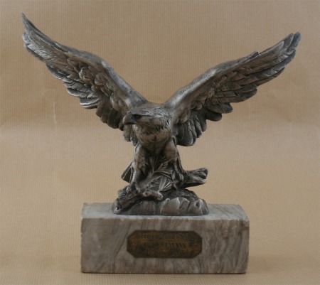 40418   imageEagle statue awarded to Gehard Gustmann, who won gold in the men’s coxed pairs, 23cm high, 27cm wing span, silvered with stone base, plaque inscribed (in German) “Winners are heroes / G. Gustmann / General Göring Regiment,” a spectacular and unique presentation statue to a member of the elite German air force