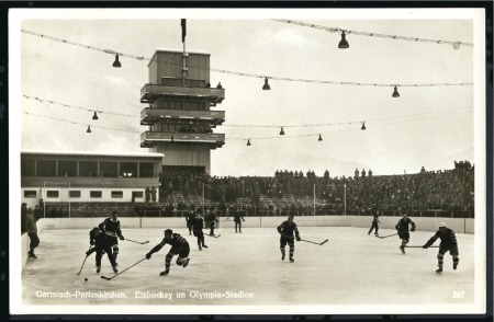 40387   1936 Garmisch-Partenkirchen, group of photocards and a book, incl. Huber-Serien – Serie 39: Passionsdorf Oberammergau set of 12 with original wrapper, and Presse-Bild-Zentrale set of 12 incl. original wrapper, both sets approx. 9x7cm, very fine; Yramos-Dresden – Bild 1-75 complete set of 75 in three groups of 25 with folders for each, very fine; and “Winter Olympia 1936” by Le Fort and Harster, 1935, HB, 48pp plus picture plates.
