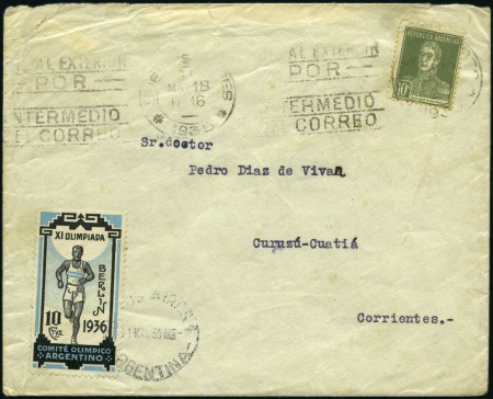 40605   imageArgentina vignette cancelled BUENOS AIRES 21 MAY 35 on inland cover to Corrientes, backflap faults, rare