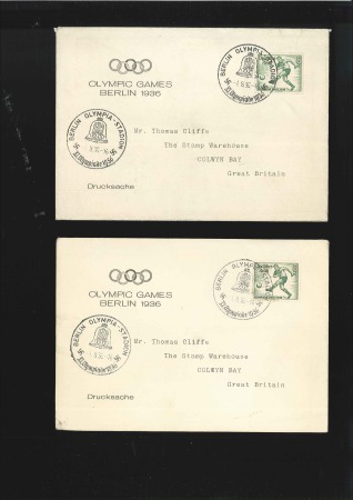 40597   imageFour envelopes with 1936 Olympic frankings incl. two with singles taken from the min.sheet with margins still attached, other two with set of 8 between them tied by Olympic Stadium cds