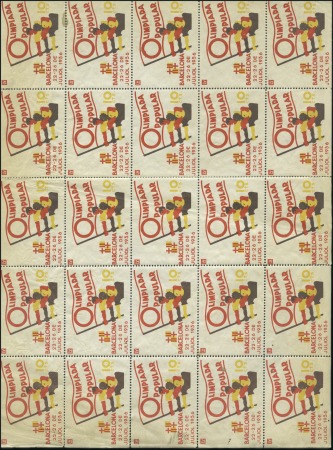 40608   image1936 Barcelona “Olimpiada Popular 22-26 De Juliol 1936” 10c vignette, in mint sheet of 25. These vignettes were used to raise money; few small faults, a rare label & extremely rare in a sheet (Comex 50)