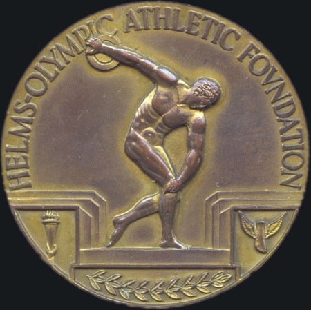 40613   image1938 Helms Foundation in Los Angeles, Recognition medal, 57mm, bronze, showing Discus thrower with legend on front and inscription above the Olympic rings on reverse, awarded to Ivor B. Thomas for “Noteworthy Contributions to International Lawn Bowling”