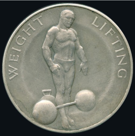 40610   image1936 British Olympic Championship at the Battersea Weightlifting Club: Silvered medal awarded to J. A. Hayes, runner up in the bantam-weight class, legend on one side, image of a weight lifter on the other, fine
