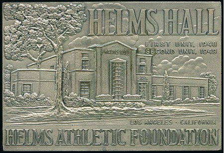 40614   imageHelms Athletic Foundation commemorative medallion, 86x59mm, silvered iron, “Presented to distinguished sportsmen and athletic leaders,” showing foundation logo with legend on one side, the other with Helms Hall, very fine