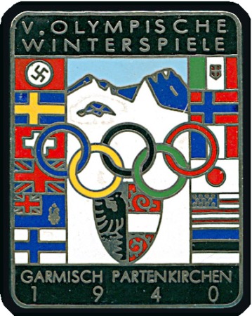 40621   imageCommemorative badges (3), 31x40mm, showing legend at top and bottom, national flags a sides, and Olympic Rings above Garmisch-Partenkirchen coat of arms in front of mountains, in bronze, silver and gold, fine