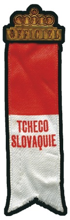 40619   image1939 8th International University Games in Monaco. Czechoslovakian Official’s badge, 28x17mm, gold plated, showing 5 rings with centre ring forming an 8, inscribed “OFFICIEL” below, with red and white ribbon inscribed with the country name, fine