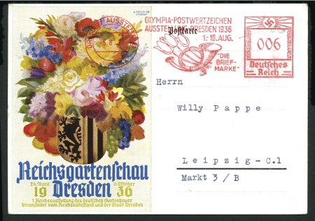 40598   imageGroup of 29 covers/cards (plus one front), showing a range of the special cancels incl. Stadium, Press, Kiel, Kanulager, Grünau, Int. Student Sports, etc., incl. Olympic Flight cover with poster vignette (not tied), Reichs Barten Schau in Dresden card with meter mark, Czech postal stationery with mixed Czech and German franking tied by special stadium cds, etc., nice group