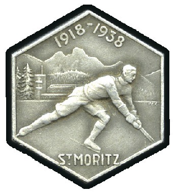 40615   imageSt. Moritz Ice Hockey badge, 25mm, silvered metal by Paul Kramer, with “1918-1938” above Ice Hockey player and “St. MORITZ,” very fine