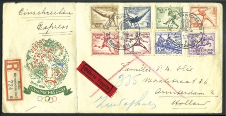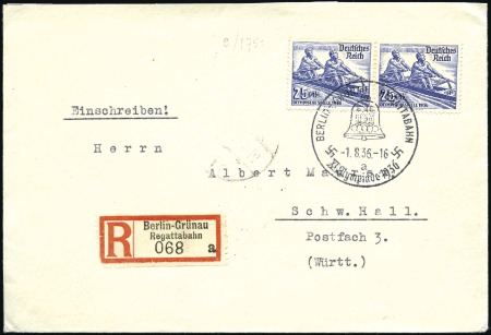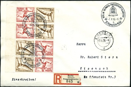 40592   image1936 Berlin. REGISTERED LABELS: Group of 8 covers with various Olympic registered labels incl. Press Quarters, Olympic Village, Stadium (Presse), Grünau Regatta, Swimming Stadium, Heerstrasse and Deutschlandhalle, all with matching special Olympic cancels, very fine (Est. € 100/150)
