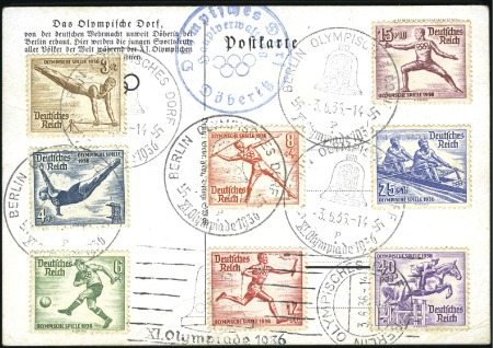 40589   imageCollection of 26 covers/cards with Olympic Bell and Roller cancels; 12 covers/cards with Roller cancels incl. Olympia Stadion (3), Olympisches Dorf (6), Int. Kanulager Müggelsee and Grünau Regattabahn (2); and 14 postcards printed by the Austrian Olympic Fund with different Olympic Bell cancellations, mostly very fine