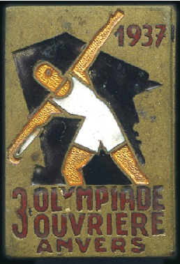 40611   image1937 3rd Worker’s Olympiad (Arbeiters Olympiade) in Antwerp. 1st Place medal awarded to J. Van den Bleeke showing man with wreath crown and legend on other side, plus two badges with the Games logo (one in French and one in German)