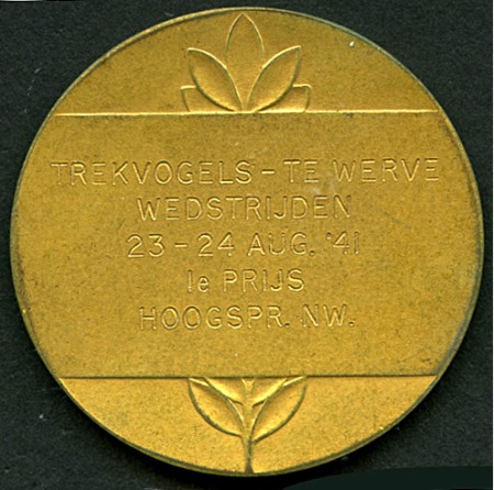 40647   image1941 Dutch Athletics Competition at Werve. First Place Prize medal for High Jump, 40mm, gold plated, showing Olympic flame over the rings with laurel branch at right, bordered by Olympic motto on front and inscription on reverse