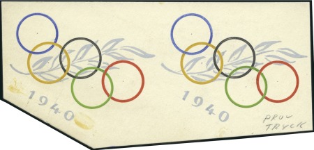 40637   imageOfficial envelope (with Games inscription at foot and Olympic Rings and official circular vignette on reverse) with “XII OLYMPIA 1940” meter franking, very fine and scarce