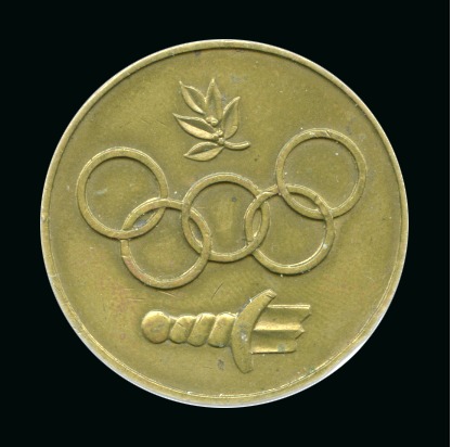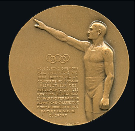 40654   imageOlympic Oath medal, 49mm, bronze, showing saluting athlete with the Olympic Rings and Oath (in French) underneath, blank reverse, very fine