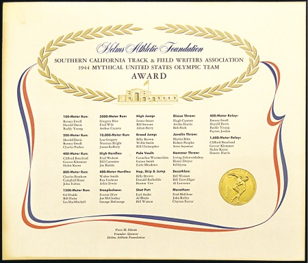 40652   image1944 Helms Athletic Foundation award certificate for the “1944 Mythical United States Olympic Team,” as chosen by the Southern California Track & Field Writers Association, with a list of the competitors chosen for each event, and a gold coloured embossed logo in the shape of a medal, minor toning around edges otherwise fine