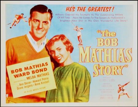 40660   image“The Bob Mathias Story” film poster, 71x55cm, a 1954 film by Francis Lyon about an athlete who won gold in the Decathlon at the 1948 and 1952 Games, showing him and his wife (who played themselves in the film), several folds and some creasing