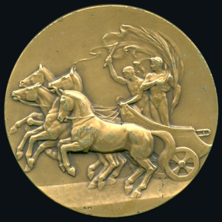 40657   imageParticipation medal die trial, 50mm, bronzed, showing the quadriga on one side and a blank reverse, some spots of abrasion