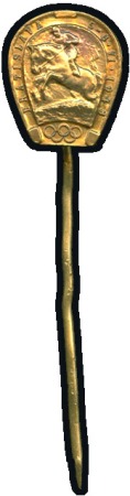 40659   imageCzech Equestrian team qualification stick-pin, 12x14mm, gilt, horse-shoe shaped showing horse jumping fence, with “BRATISLAVA 5-6.VI.1948” around border and Olympic Rings at bottom, fine