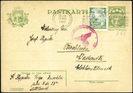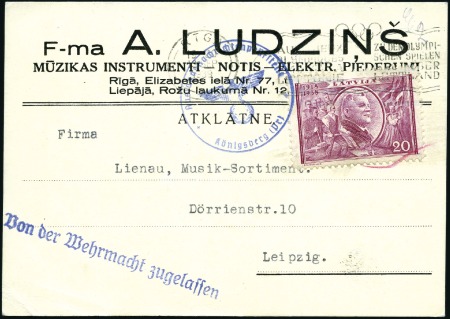 40644   image1940 Riga code A Olympic machine cancel tying 10s to 10s postal stationery card, with inscription “AUX JEUX OLYMPIQUES 1940 VIA LA LETTONIE”, censor hs, scarce