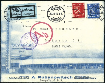40641   image1939 (Nov 18) Envelope to Helsinki with special Olympic machine cancel on reverse, censored by the Finnish Secret Service with several censor hs on the obverse, some peripheral faults, an interesting cover