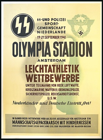 40646   image1941 “SS-UND POLIZEI / SPORT- / GEMEINSCHAFT / NIEDERLANDE / 19-21 SEPTEMBER 1941 / OLYMPIA STADION / AMSTERDAM” poster for the SS and Police Athletics Championship in the Netherlands, 90x120cm, backed on linen, attractive and rare