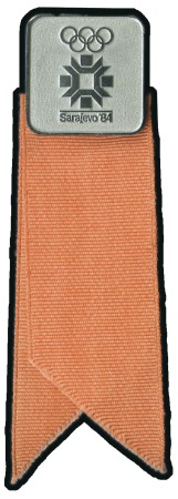 40788   imageParticipant’s pin badge, with Olympic Rings above Games logo, orange ribbon, very fine