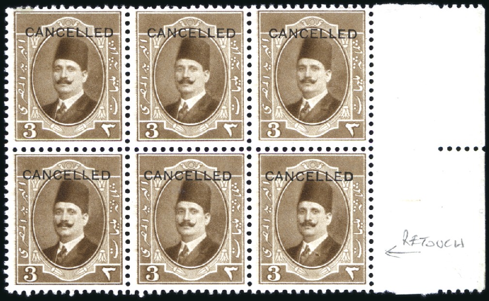 1923-24 First Portrait issue 3m brown overprinted “CANCELLED” in mnh block of 6, showing retouch on position 50, couple of gum bends, fine (Image 1)