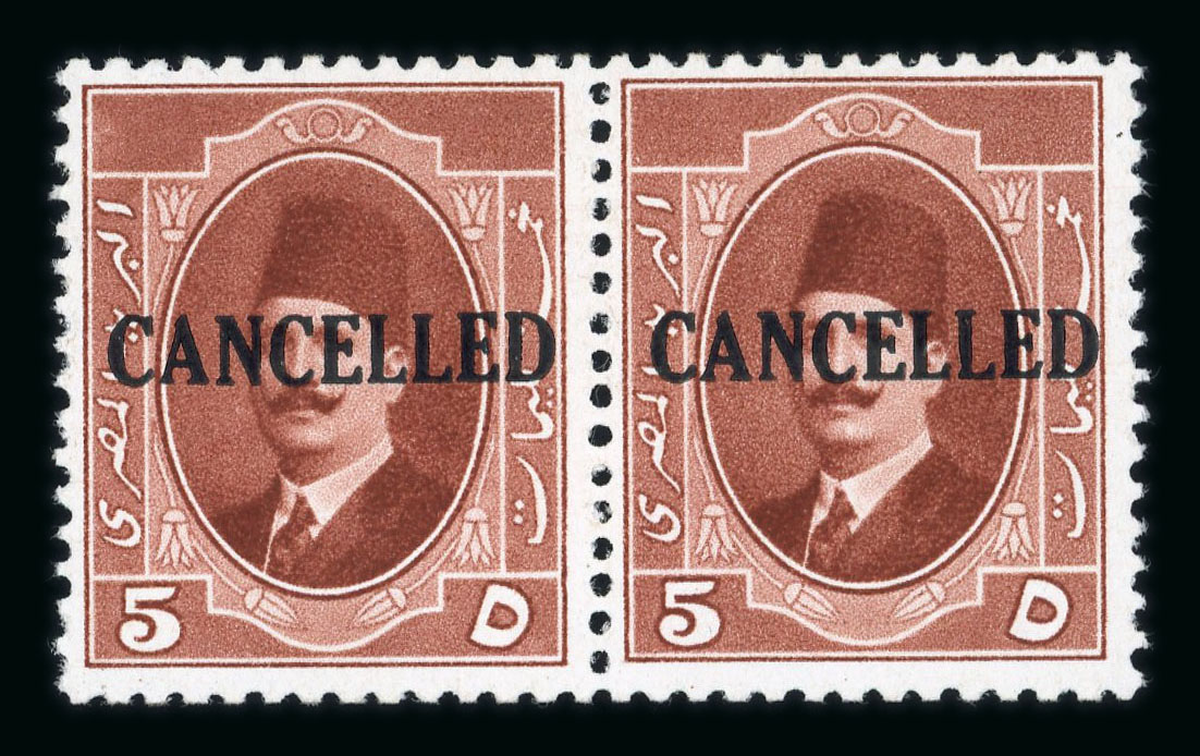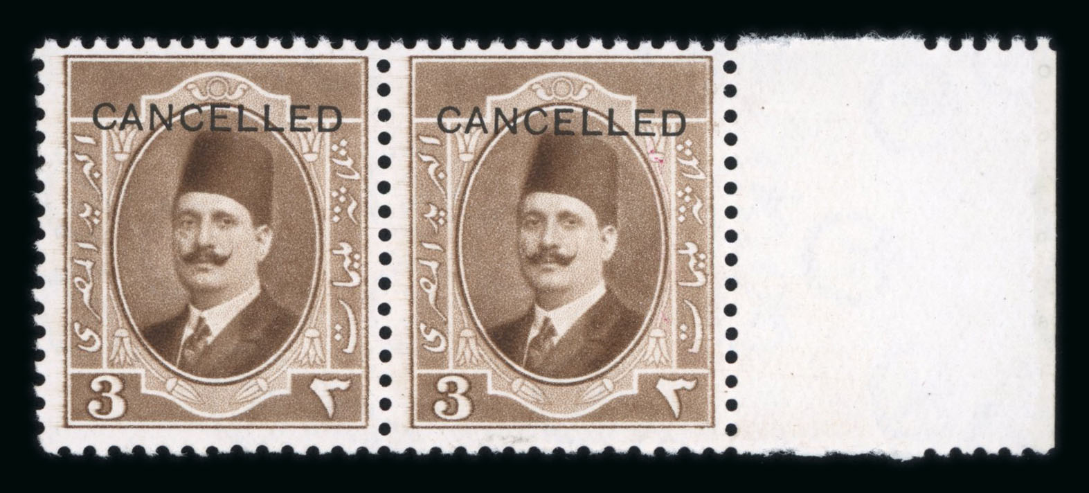 1923-24 King Fouad 1st Portrait Issue: 3m dark-brown, mint nh right sheet marginal horizontal pair, both with CANCELLED ovpt, one creased, very fine (Nile Post Specimen Type A) (Image 1)