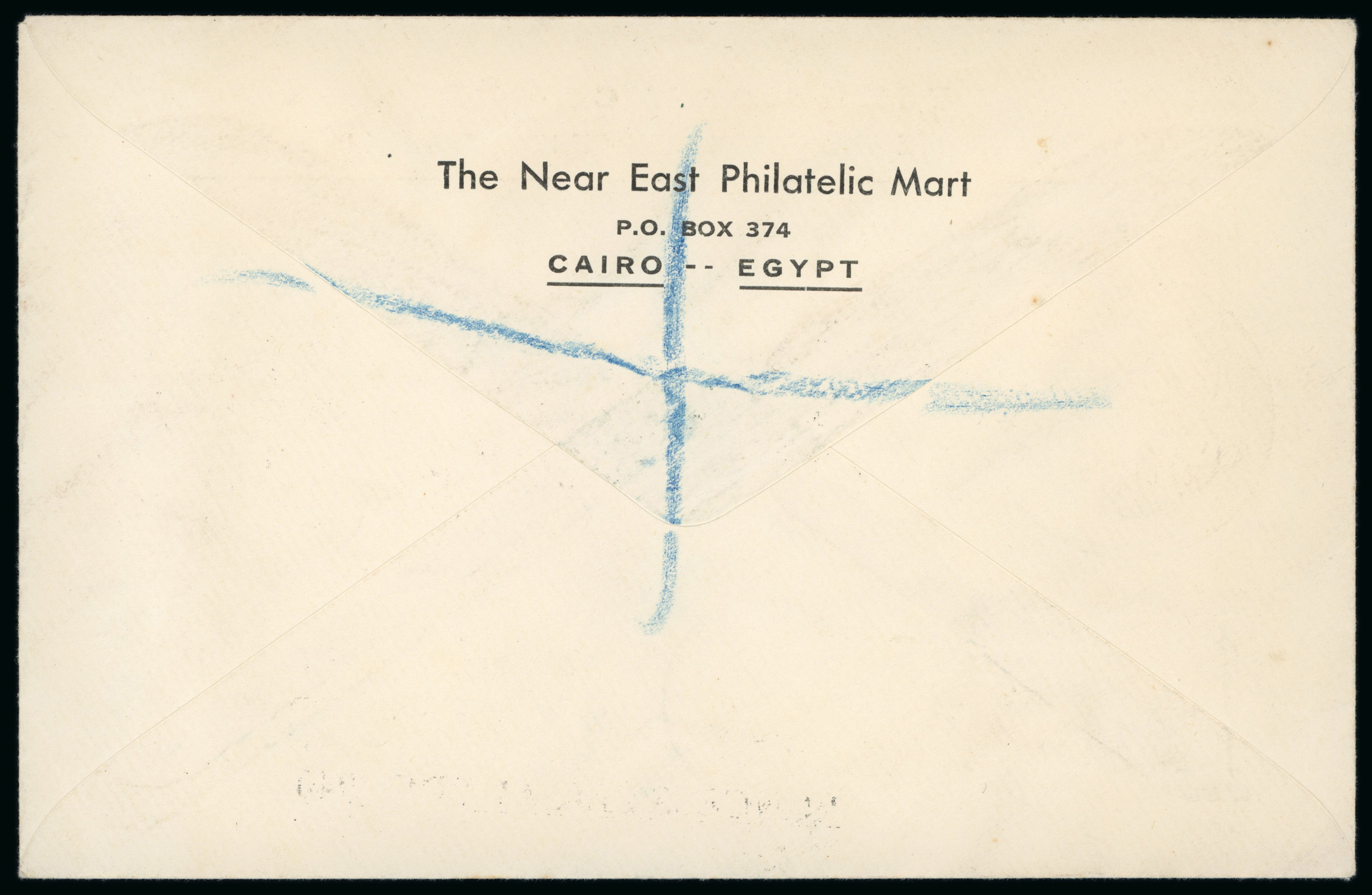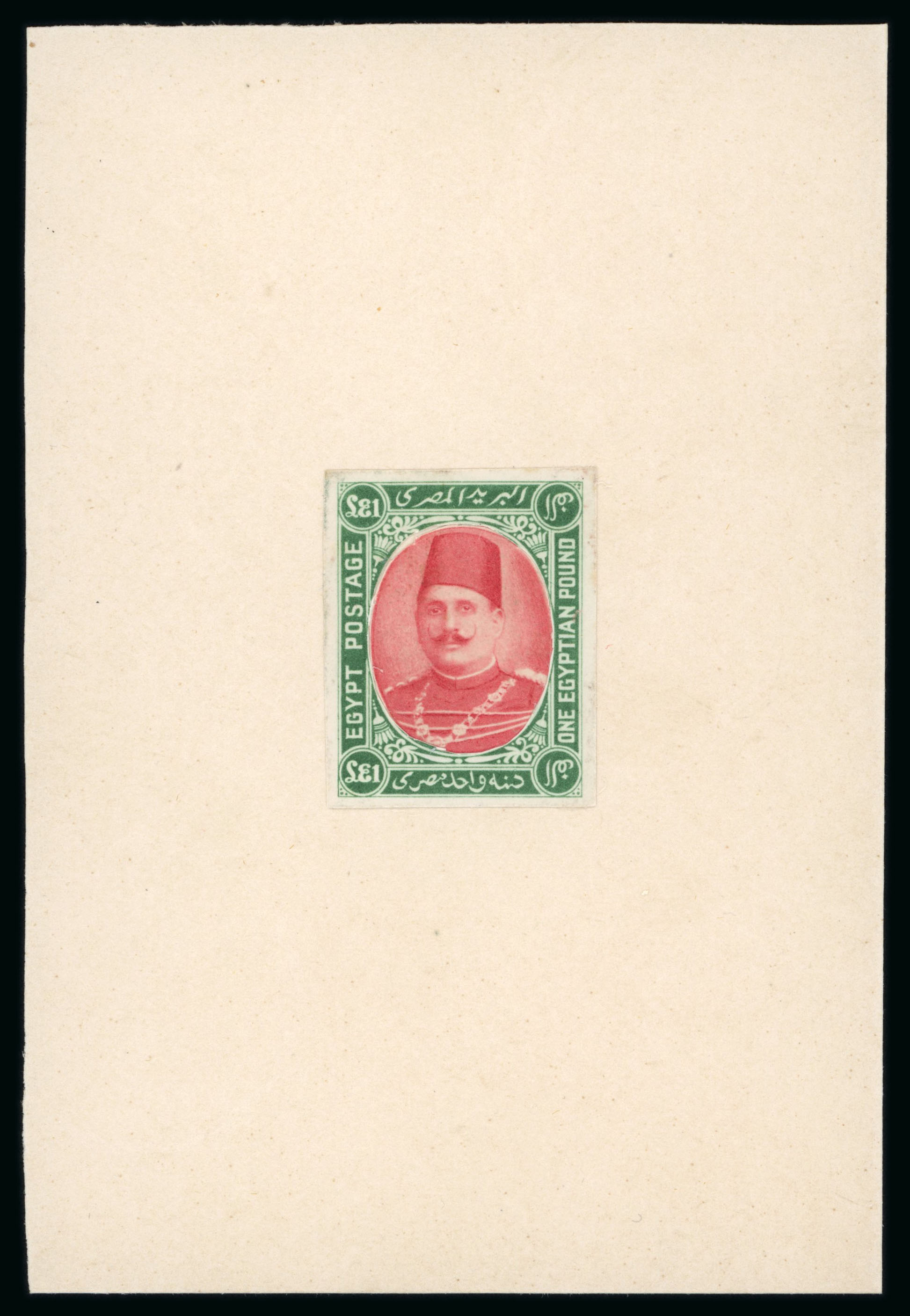 Essay by Harrison & Sons of London for the Consular Service. An imperforate stamp depicting King Fouad with a value of 200m., affixed on gold-edged card handstamped in purple, and the letter B, wonderful, attractive and very rare. (Image 1)