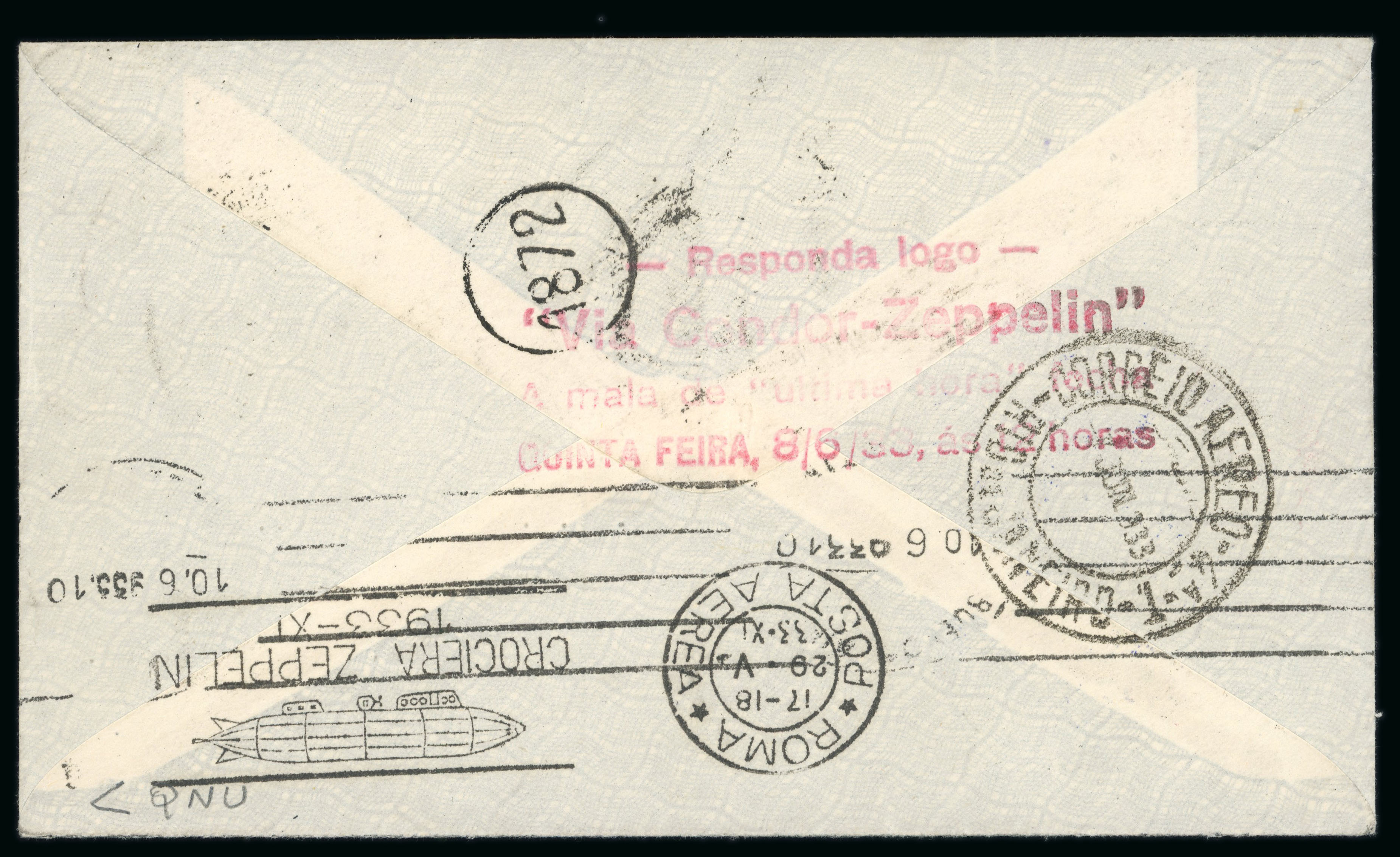 Italy: 1933 (May 29) Graf Zeppelin cover to Argentina with two Zeppelin 10l and a 1l25, tied by Rome "Posta Aerea Zeppelin" cds, with blue cachet at lower left, Milan transit, Rome bs and Rio de Janeiro, very fine. (Image 1)