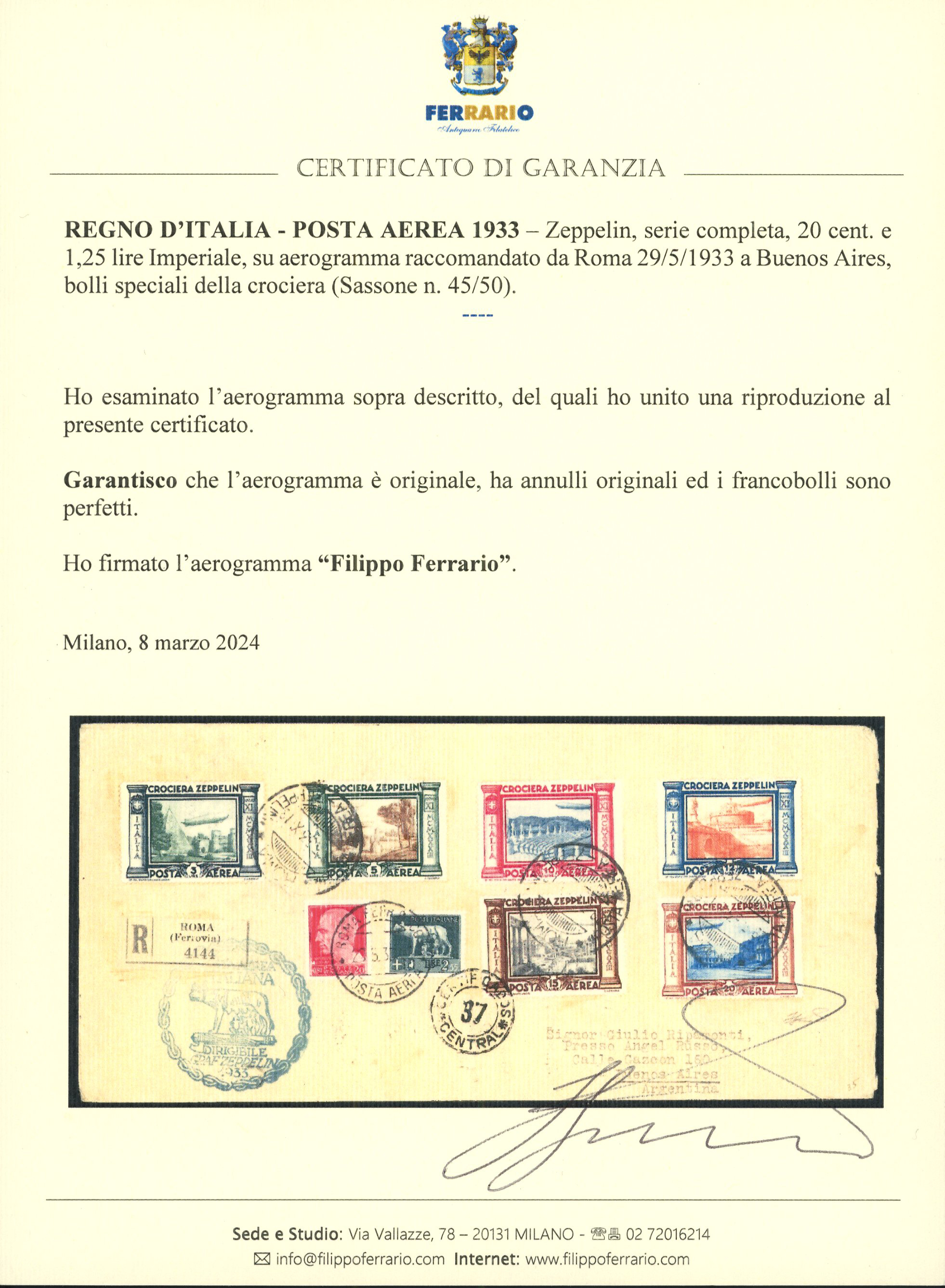 Italy: 1933 (May 29) envelope sent registered airmail to Argentina with Zeppelin complete set tied by Rome Ferrovia cds, very fine and scarce; cert. Ferrario (2024). (Image 1)