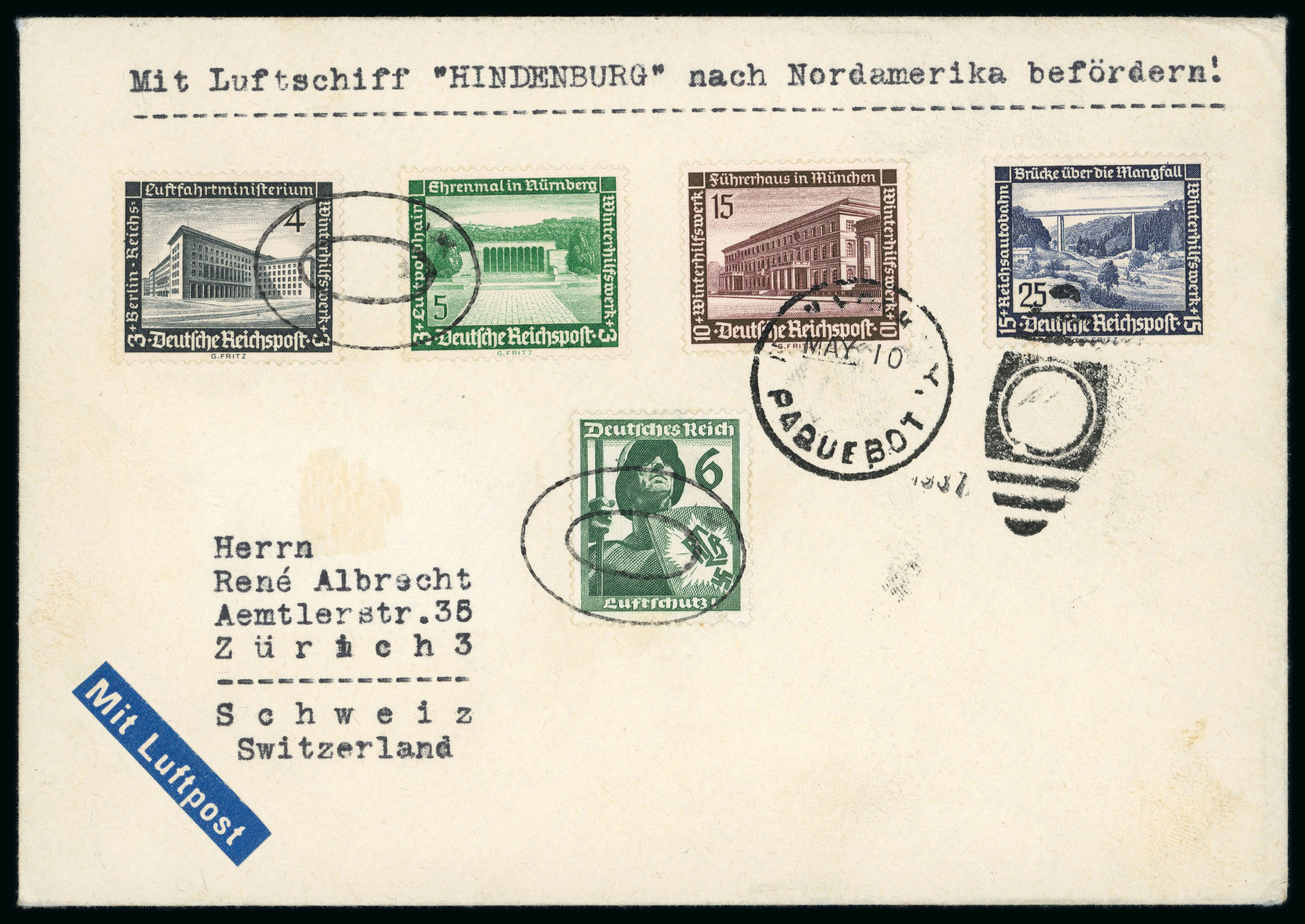 Hindenburg Crash Cover. 1937 postcard endorsed "Mit Luftschiff Hindenburg nach USA", addressed to Germany and franked with German Reich 5pf airmail and block of five 12pf, prepared as mail for the return trip of the Hindenburg and
