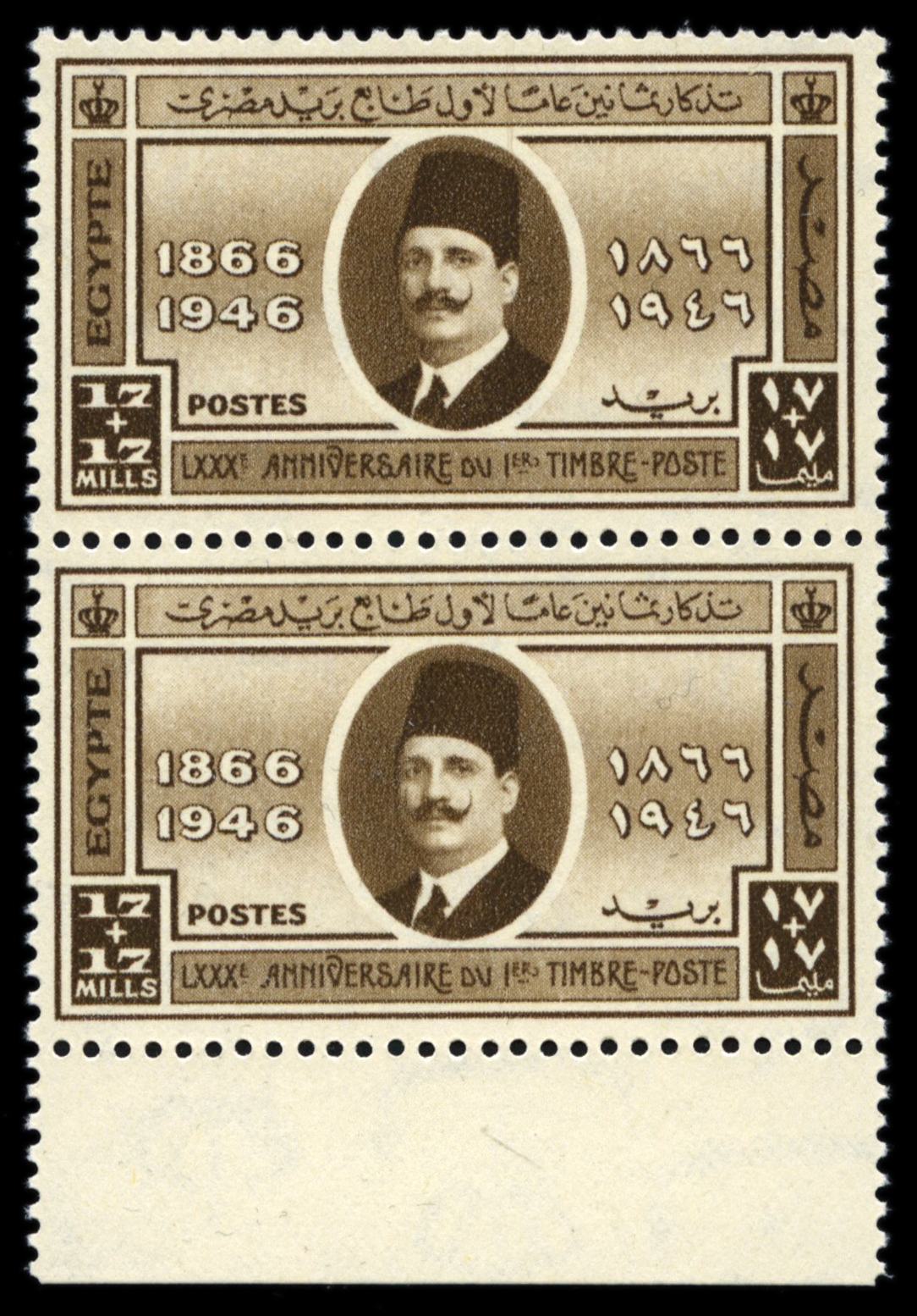 1946 Anniversary of Egypt's First Postage Stamp mint n.h. perf. and imperf. miniature sheet proofs showing large Crown and Arabic F watermark variety, very fine and very rare. (Image 1)