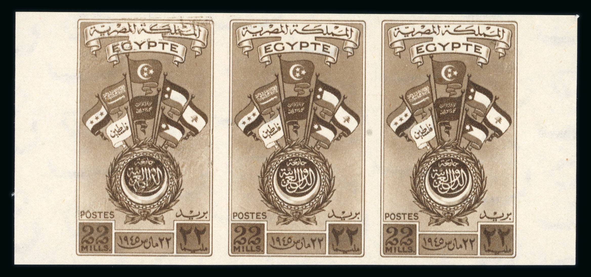 1945 Arab Countries Union colour trial in brown in imperf. strip of three, mint nh, very fine and very rare (taken from the unique sheet of 9 in this colour) (Image 1)