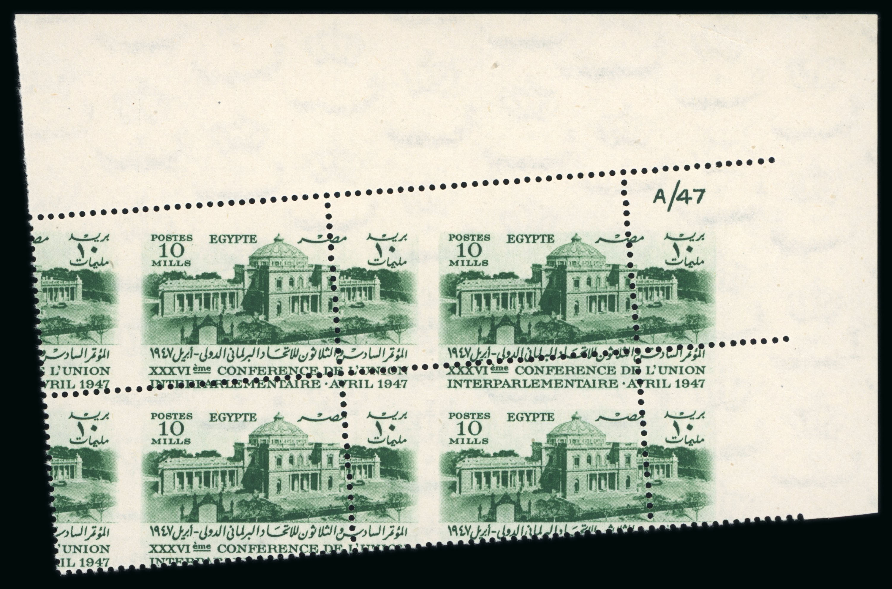 1947 Conference of the Interparliamentary Union, 10m green, Royal oblique perforations in mint nh top right corner sheet marginal plate block of four, numbered in Roman letters A/47, fresh, very fine and an extremely rare control block,